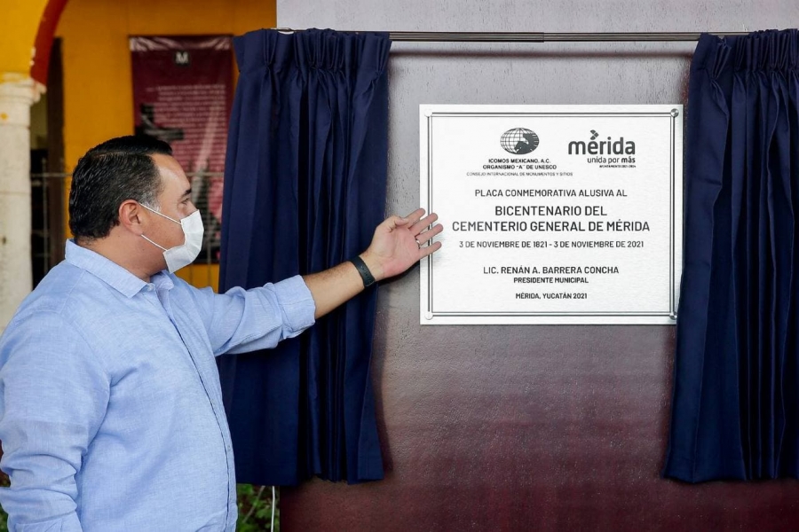 En compañía de los regidores de la comisión de Cultura y Espectáculos y del doctor Raúl Enrique Rivero Canto, coordinador del Comité Científico Nacional de Ciudades y Pueblos Históricos de México perteneciente al Consejo Internacional de Monumentos y Sitios, el alcalde develó la placa alusiva al Bicentenario del Cementerio General, acto con el que también dio por concluido el simposio académico.