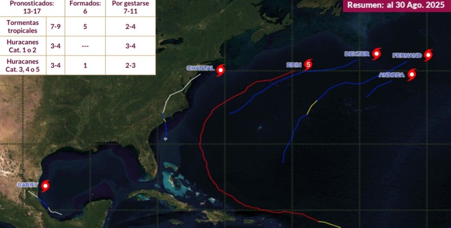 Hernández Rodríguez detalló que hasta la fecha se han formado seis sistemas tropicales con nombre en el Atlántico, Golfo de México y Mar Caribe: cinco tormentas tropicales, Andrea, Barry, Chantal, Dexter y Fernand, y un huracán categoría 5, Erin, de los cuales ninguno representó riesgo para Yucatán.