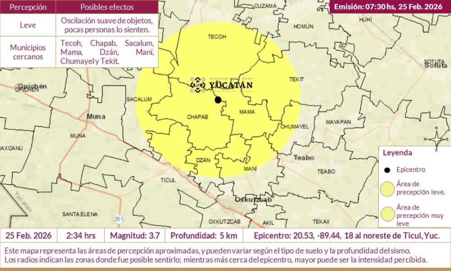 Con base en el análisis realizado por el Centro de Estatal de Monitoreo y Alertamiento, la información emitida por el SSN, los municipios de Yucatán cercanos al epicentro fueron Tecoh, Chapab, Sacalum, Mama, Dzán, Maní, Chumayel y Tekit.