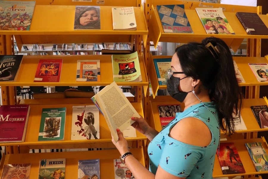 El público visitante podrá apreciar y leer 107 libros o revistas, de Elena Poniatowska, Ángeles Mastretta, Leonora Carrington, Luisa M. Alcott, Elvia Rodríguez Cicerol, Isabel Allende y más, así como diversos estudios sobre las mujeres o investigaciones hechas por ellas, que abordan temas sobre Derechos Humanos, grupos productivos, violencia y asentamientos humanos, entre varios tópicos.