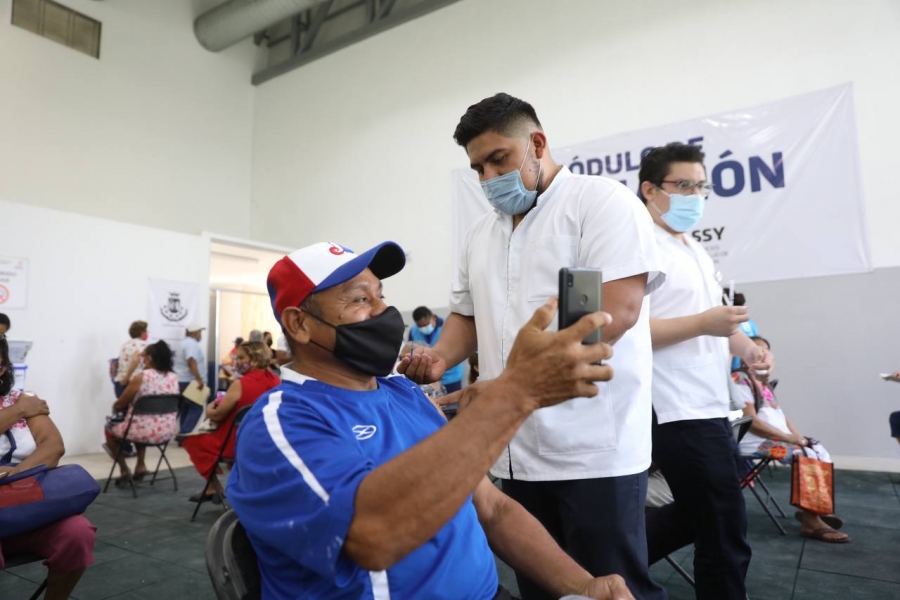 Junto al titular de la SSY, Mauricio Sauri Vivas y del coordinador estatal para la vacunación Covid-19, Capitán de Corbeta Carlos Gómez Montes de Oca, Vila Dosal recorrió las áreas de recepción, aplicación de la vacuna y supervisión donde platicó con las mujeres y hombres que este día acudieron a este centro habilitado en el sur de la capital y entre las que se encontraba María Guadalupe Chan Estrella.