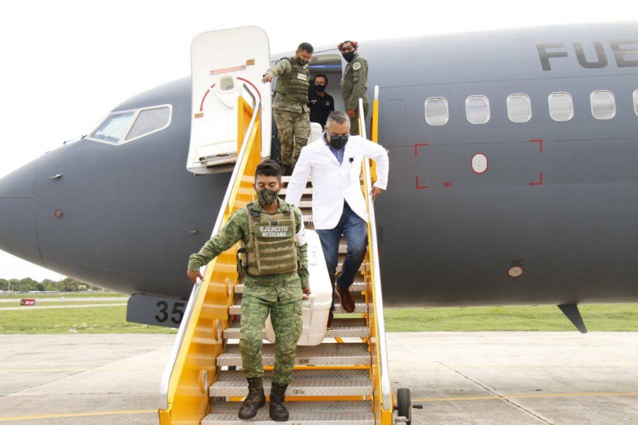 El subdirector de Salud Pública de la Secretaría de Salud del estado (SSY), Carlos Isaac Hernández Fuentes, acudió a la Base Aérea Militar (BAM) Número 8 para supervisar el nuevo lote de vacunas, de las cuales 119 mil 340 son de las farmacéuticas Pfizer y 30 mil de AstraZeneca, que llegaron a bordo de la aeronave Boeing 737/200 matrícula FAM-3526, proveniente de la Ciudad de México, que tocó territorio estatal a las 14:15 horas.