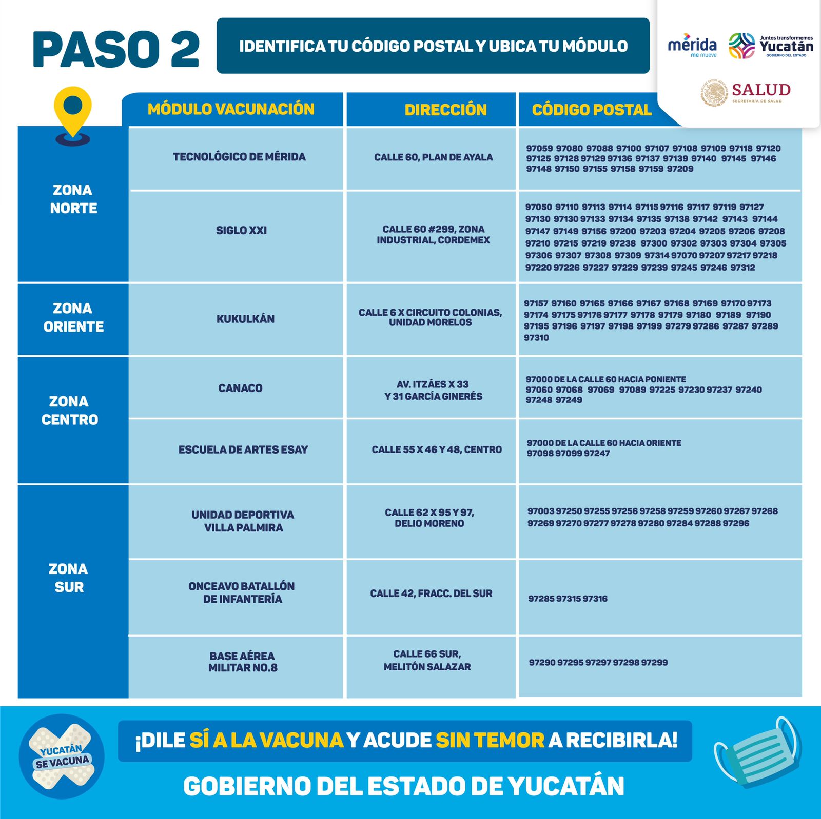 Cabe recordar que el macrocentro o módulo de vacunación que les corresponde será con base en su Código Postal, los cuales estarán distribuido de la siguiente forma: