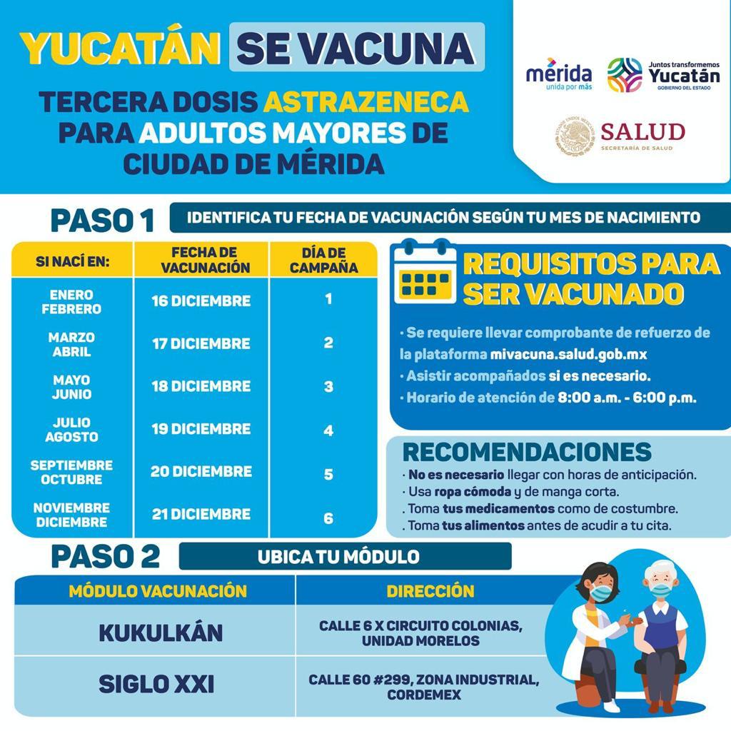 Para el caso de Mérida los módulos de vacunación se ubican en el Centro de Salud Urbano de la colonia Santa Rosa de la SSY, la Unidad de Medicina Familiar 59 del Instituto Mexicano del Seguro Social y la Unidad de Medicina Familiar del Instituto de Seguridad y Servicios Sociales de los Trabajadores del Estado (Issste) en la colonia Lindavista.