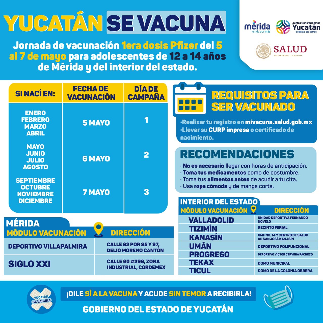 Esta etapa que se llevará a cabo del jueves 5 al sábado 7 de mayo, en el caso de la capital yucateca, de manera coordinada con la Secretaría del Bienestar, las Fuerzas Armadas y el Ayuntamiento de Mérida, se desarrollará a través del Macrocentro de vacunación en el Centro de Convenciones "Yucatán Siglo XXI” y el módulo habilitado en la Unidad Deportiva “Villa Palmira”.