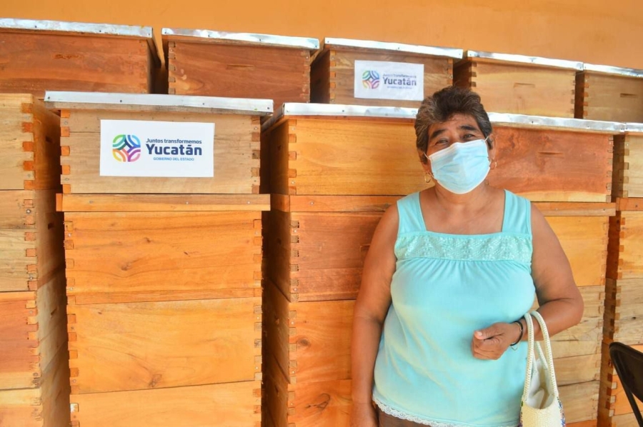 Al recibir muy emocionada sus 10 cajas apícolas, Irma Guadalupe Durán Quintal comentó que la ayuda que reciben sin duda se anima para seguir con la actividad, a pesar de las pérdidas que sufrió con el paso de las tormentas.