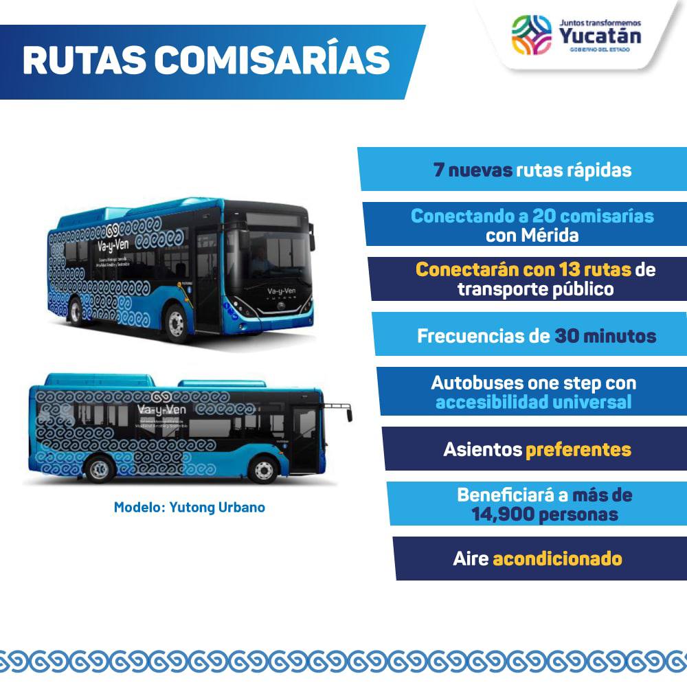 Como anunció en días pasados el gobernador Mauricio Vila Dosal, estos siete trayectos rápidos conectarán 20 comisarías meridanas con la capital yucateca y 13 rutas del transporte público, con frecuencias de 30 minutos, lo que beneficiará a más de 14 mil 900 personas.