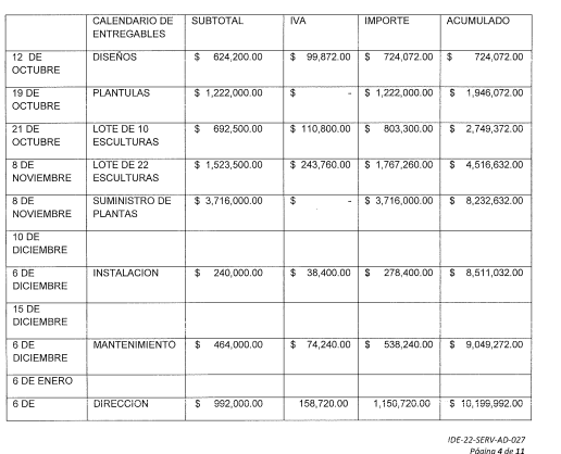 En el documento se establece también que la entrega de la totalidad de las 103 mil 162 plantas que se utilizarían en el programa “Camino de las Flores 2022” se realizaría entre el 12 de octubre y el 1 de diciembre de 2022 para que el Idefeey liquidara antes del 6 de enero del 2023 la totalidad de los recursos tal y como se detalla en el anexo que se puede leer a continuación.