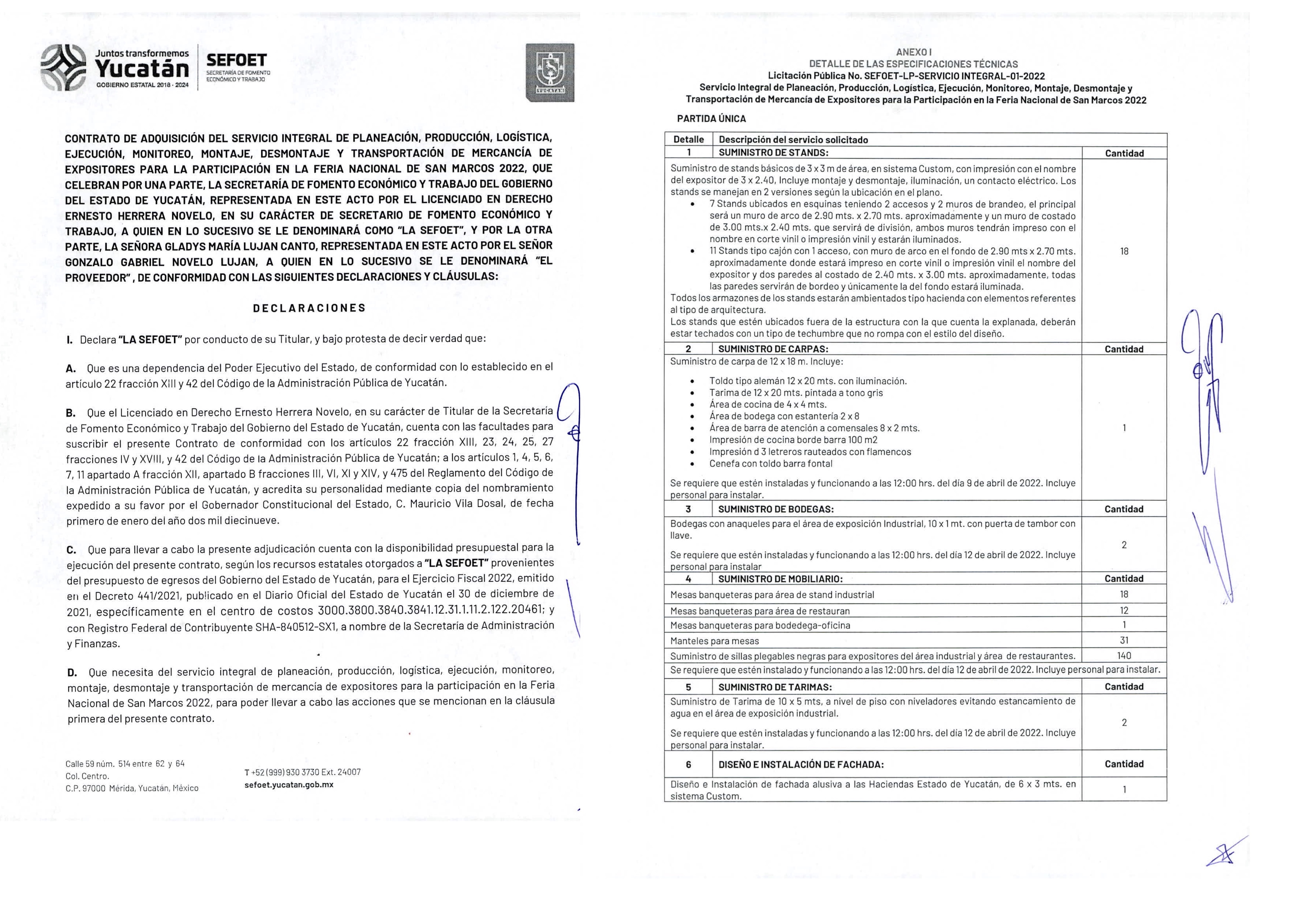 Mediante el contrato SEFOET-LP-SERVICIO INTEGRAL -01-2022 se acordó un pago de 4 millones 210 mil 220 en favor de la empresaria Gladys María Luján Canto, quien se encargó de la planeación, producción, logística, ejecución, monitoreo, montaje desmontaje y traslado de expositores que participaron en la Feria Nacional de San Marcos 2022.