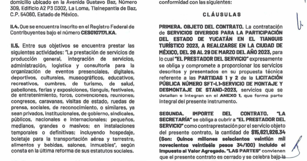 Y es de acuerdo al contrato SFT/ 028/ 2023 en poder de Rompecabeza se contrato a la empresa Creatividad y Espectáculos S.A. de C.V. solamente para el montaje y desmontaje del stand con el que Yucatán participaría en el Tianguis Turístico.