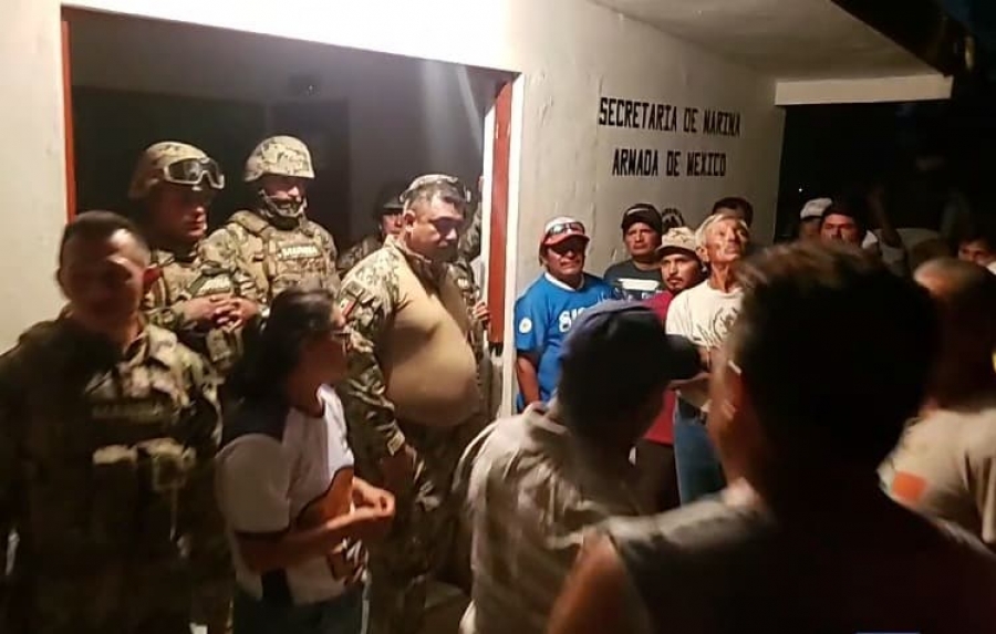 Al congregarse frente a las instalaciones de la Naval la tarde de este lunes, uno de los oficiales que encaró a los pobladores, de mantera temeraria cortó cartucho en su arma de carga y amenazó a los inconformes, aunque de inmediato fue jalado al interior del inmueble para evitar que los ánimos se caldearan.