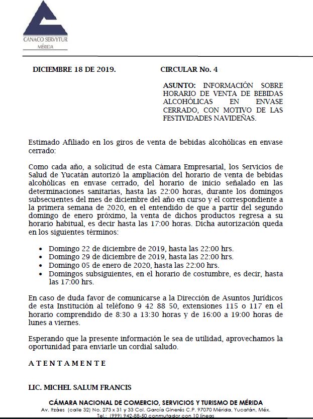 Según la misiva, lo anterior se derivó de una petición realizada por la Canaco Mérida la cual fue autorizada por Servicios de Salud de Yucatán (SSY) a partir del próximo domingo 22 hasta el 5 de enero.