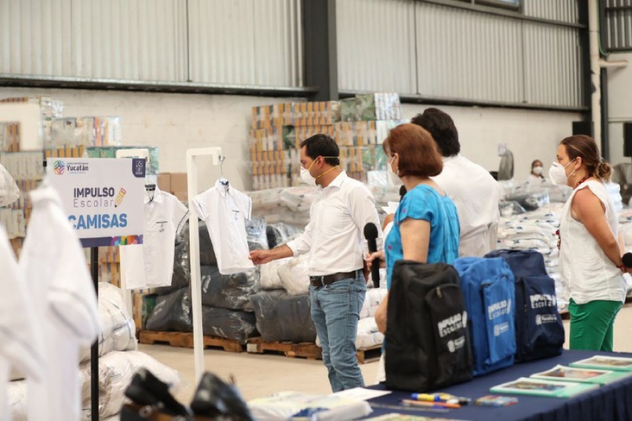 Y para continuar apoyando a la economía de las familias yucatecas impactadas por la inactividad generada por la pandemia del coronavirus, el gobernador también verificó los paquetes de uniformes, conformados por dos camisas, un par de zapatos y una mochila, los cuales acompañarán a los útiles escolares.