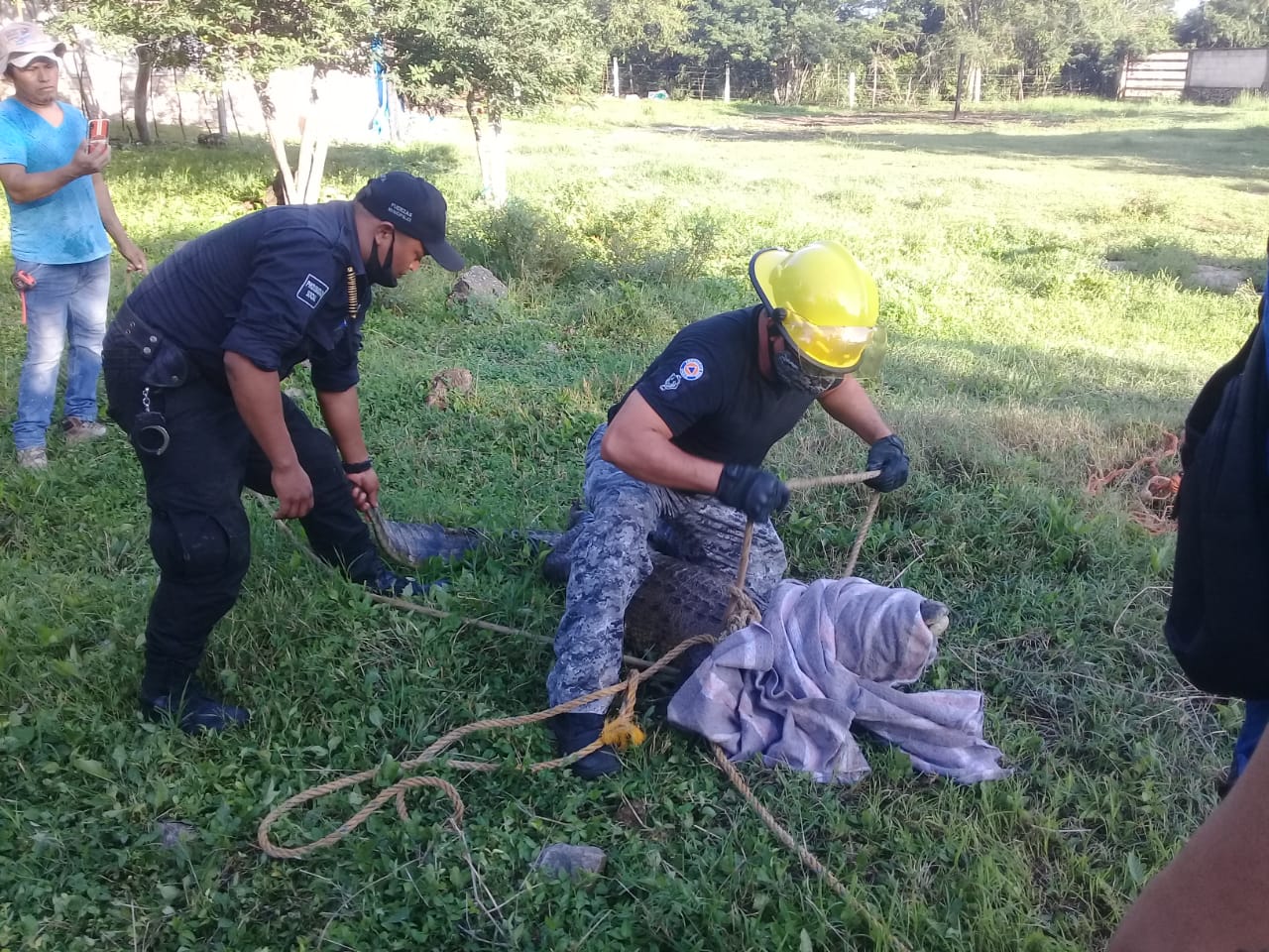 Con ayuda de una colcha lograron taparle los ojos, sujetar al saurio por la enorme quijada., para después asegurar mandíbula con cinta y amarrarlo de sus patas.