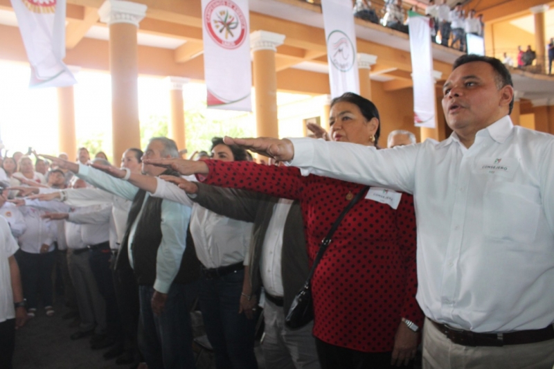 El exgobernador del estado Rolando Zapata Bello reapareció en un acto de su partido -el Revolucionario Institucional- luego de meses de permanecer alejado de la vida pública, para tomar protesta como consejero político, la mañana de este domingo; el ex mandatario estatal accedió a responder un par de preguntas a un grupo de reporteros para después dar la espalda a los comunicadores.