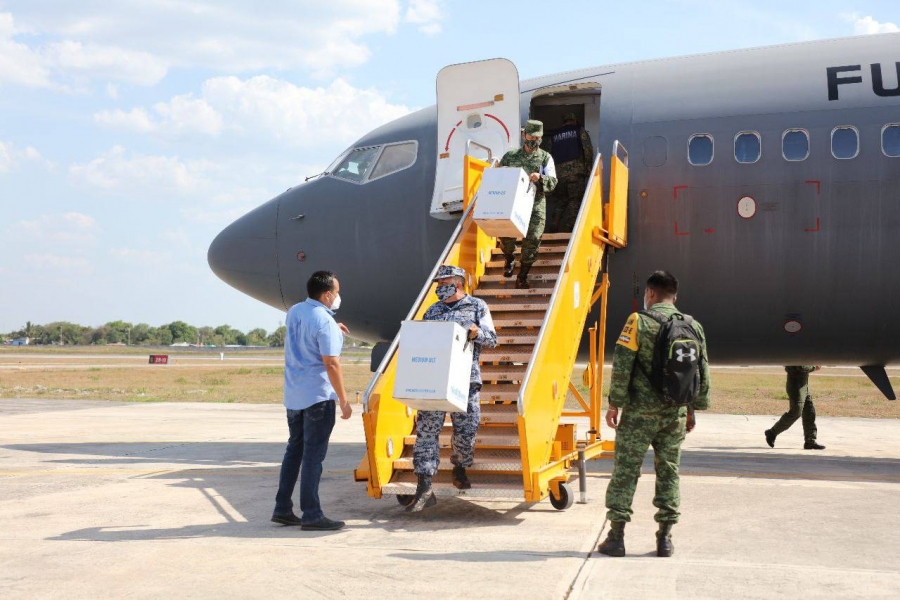 El titular de la Secretaría de Salud del estado (SSY), Mauricio Sauri Vivas, acudió a la Base Aérea Militar (BAM) Número 8 para supervisar la llegada del nuevo lote de vacunas de las farmacéutica Pfizer y Sinovac, a bordo de la aeronave Boeing 737/800 matrícula 3526, proveniente de la Ciudad de México, que tocó territorio estatal a las 3:38 de la tarde.
