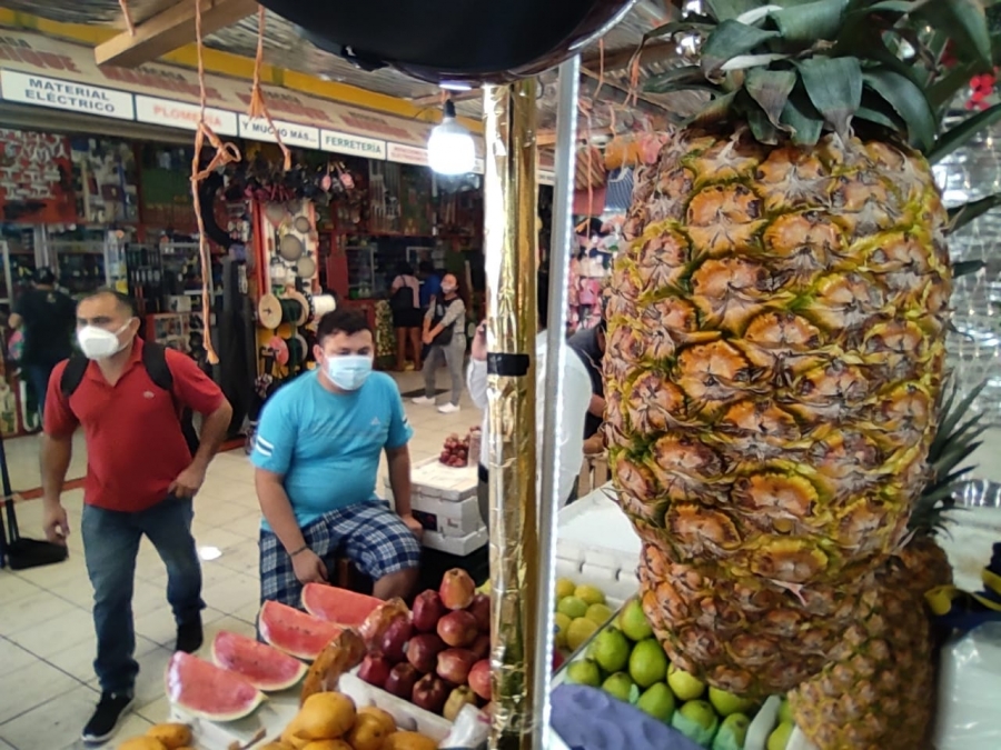 Son las 10:30 horas, junto con mis compañeros, nos internamos en las calientes entrañas del añejo centro de abastos, con el objetivo de documentar a los locatarios del Mercado "Lucas de Gálvez", quienes atienden sus puestos con cubrebocas y toda la sana distancia que el espacio les permite mantener.