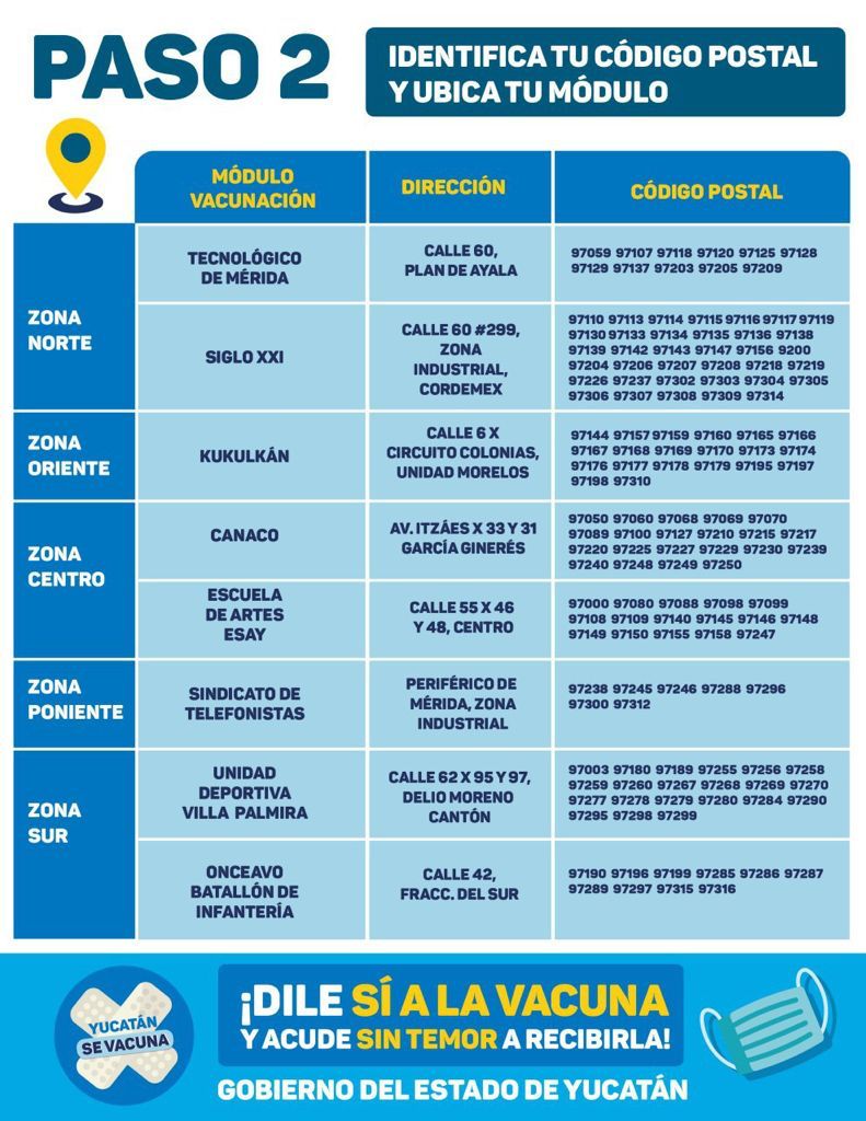 Una vez que las personas de 50 a 59 años se hayan registrado en la mencionada plataforma federal deberán ubicar el macrocentro o módulo de vacunación que les corresponde con base en su Código Postal, los cuales estarán distribuido de la siguiente forma: