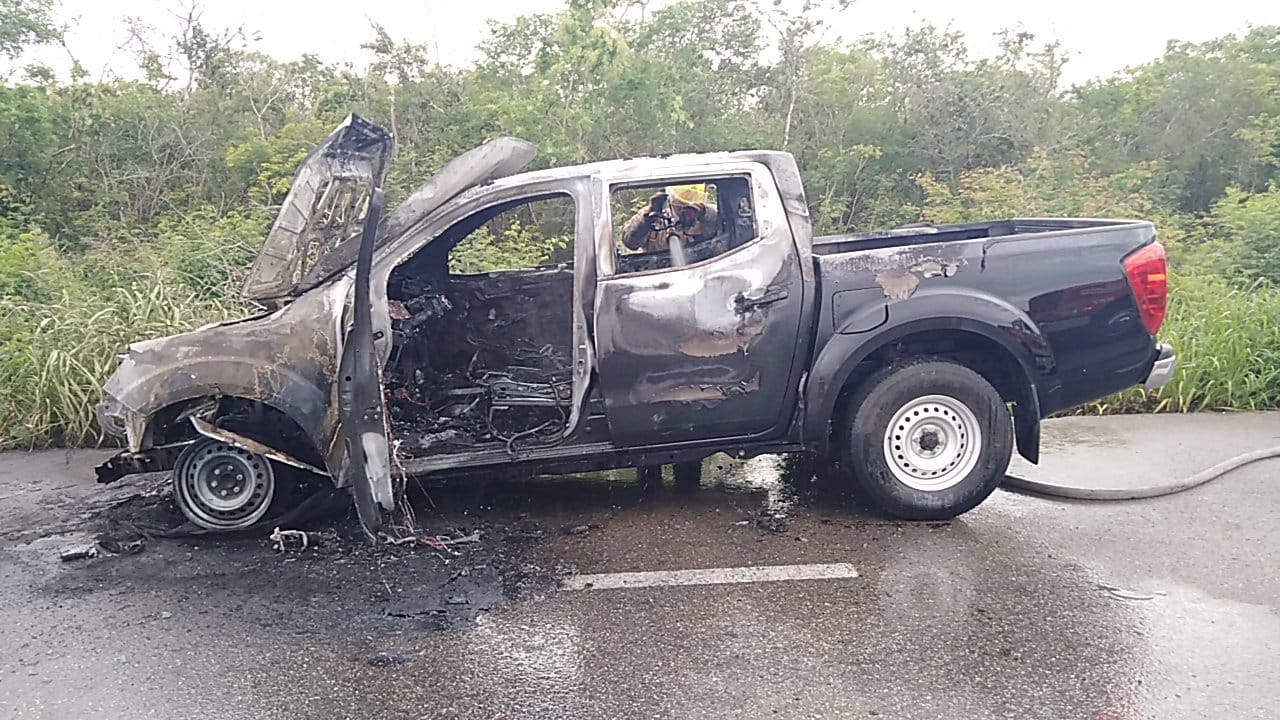 Al abrir el cofre de la camioneta, el guiador se percató que parte del motor ardía en llamas por lo que intentó apagarlo sin obtener un resultado positivo.