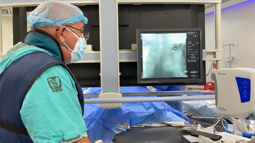 Por su parte, el doctor Francisco Javier Cardosa Torres, encargado de la Jefatura de Cardiología y Hemodinamia de la UMAE en Mérida y líder del equipo, informó que este procedimiento se realiza en una sala de Hemodinamia, bajo estrictos protocolos de seguridad e higiene, así como la realización de pruebas rápidas de detección de Covid-19 para garantizar la seguridad a los pacientes y personal de esta Unidad.