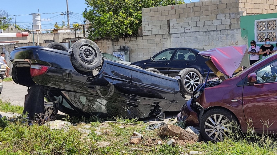Debido al golpe, el vehículo Sentra quedó volcado con las llantas hacia el cielo, mientras que el Aveo sufrió daños en su parte frontal.
