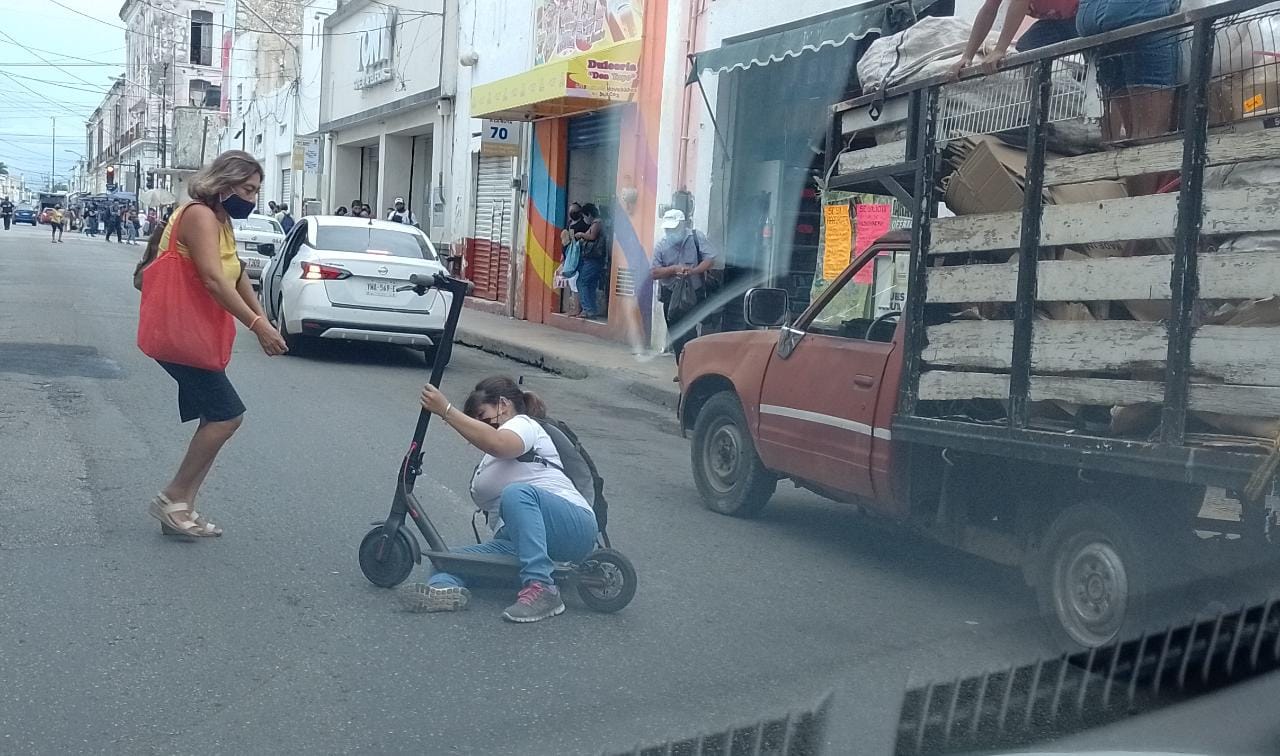 El incidente que quedó registrado en fotografías, ocurrió la tarde de este martes, en la calle 54 con 63 y 65 del Centro Histórico de Mérida, donde la mujer que guiaba la patineta electrónica cayó al piso luego de perder el equilibrio debido a un bache en el pavimento.