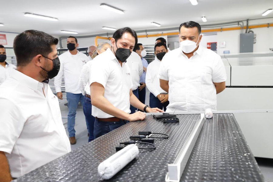 Acompañado de Francisco González Arceo, director General, y Christabel Ku Ojeda, directora de Finanzas y Contabilidad, Barrera Concha recorrió el área de producción para observar el proceso de elaboración de los paneles solares, donde la explicación del procedimiento estuvo a cargo Luis Arceo, gerente del área de Producción, y Marcos Ramos, encargado de la zona.