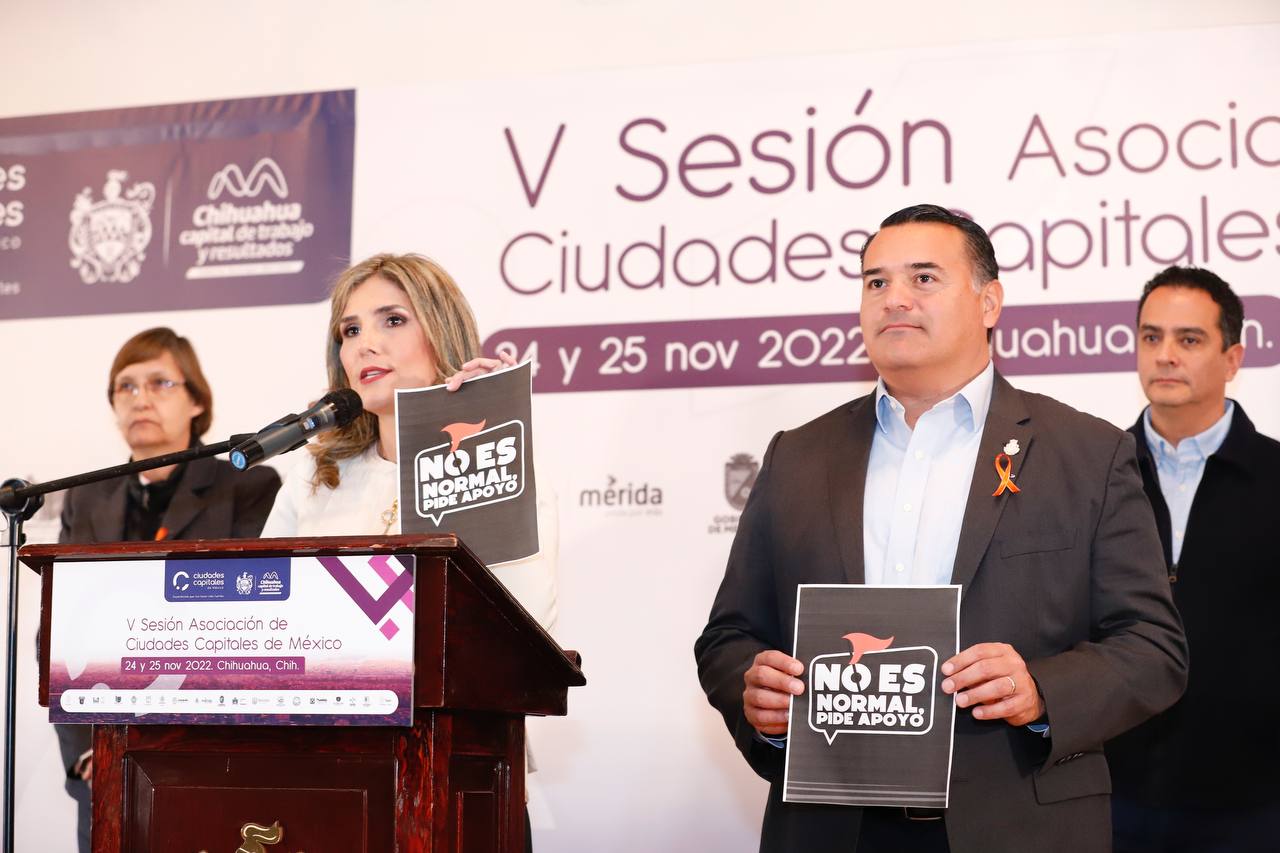 Al cierre de la rueda de prensa, la alcaldesa de Colima, Margarita Moreno González, junto con los alcaldes presentes, sostuvieron los carteles de la campaña “No es Normal, Pide Apoyo” como parte de la campaña que desarrollan en su municipio como parte del Día Internacional de la Eliminación de la Violencia contra la Mujer.