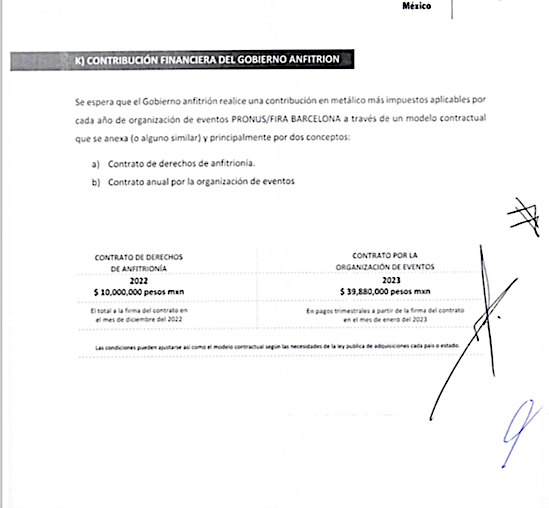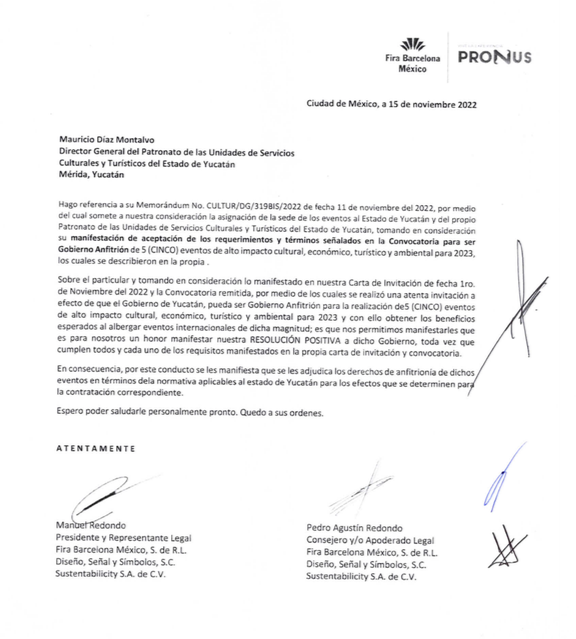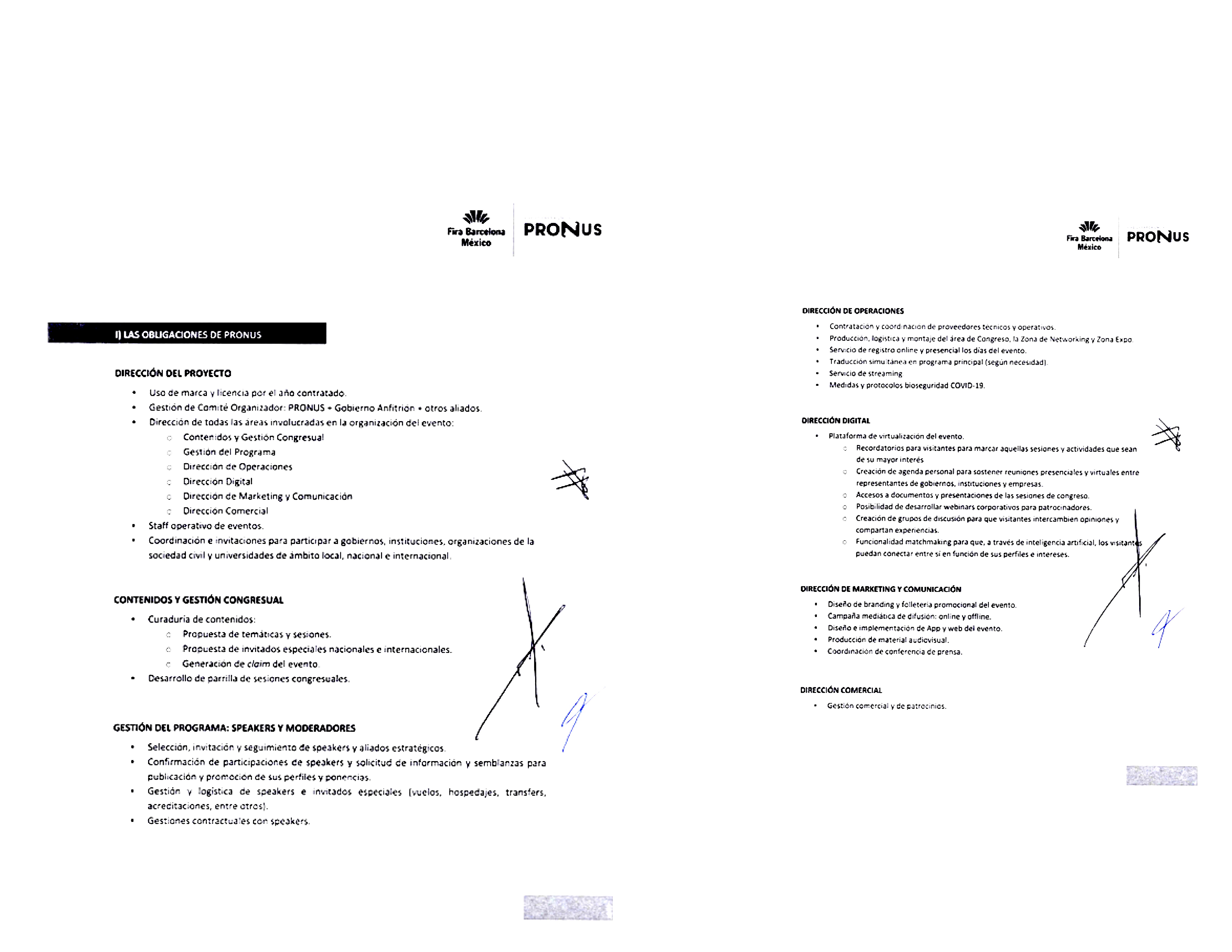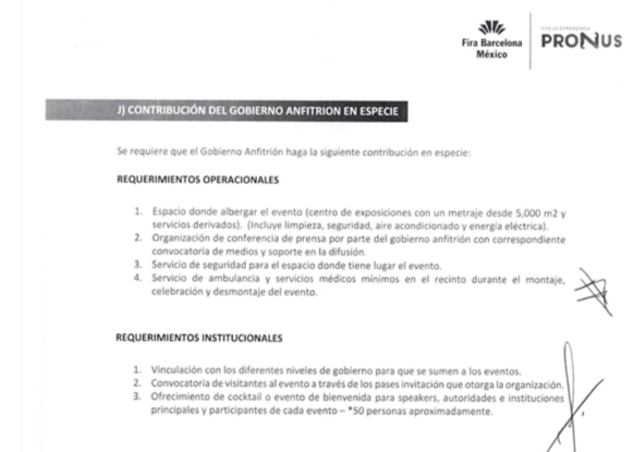 En el documento firmado por Manuel Rafael Redondo Peralta, presidente de Fira Barcelona México y Pedro Agustín, apoderado legal de la misma empresa, se establecen los compromisos que ambas partes contraerán por la realización de dichas ferias.