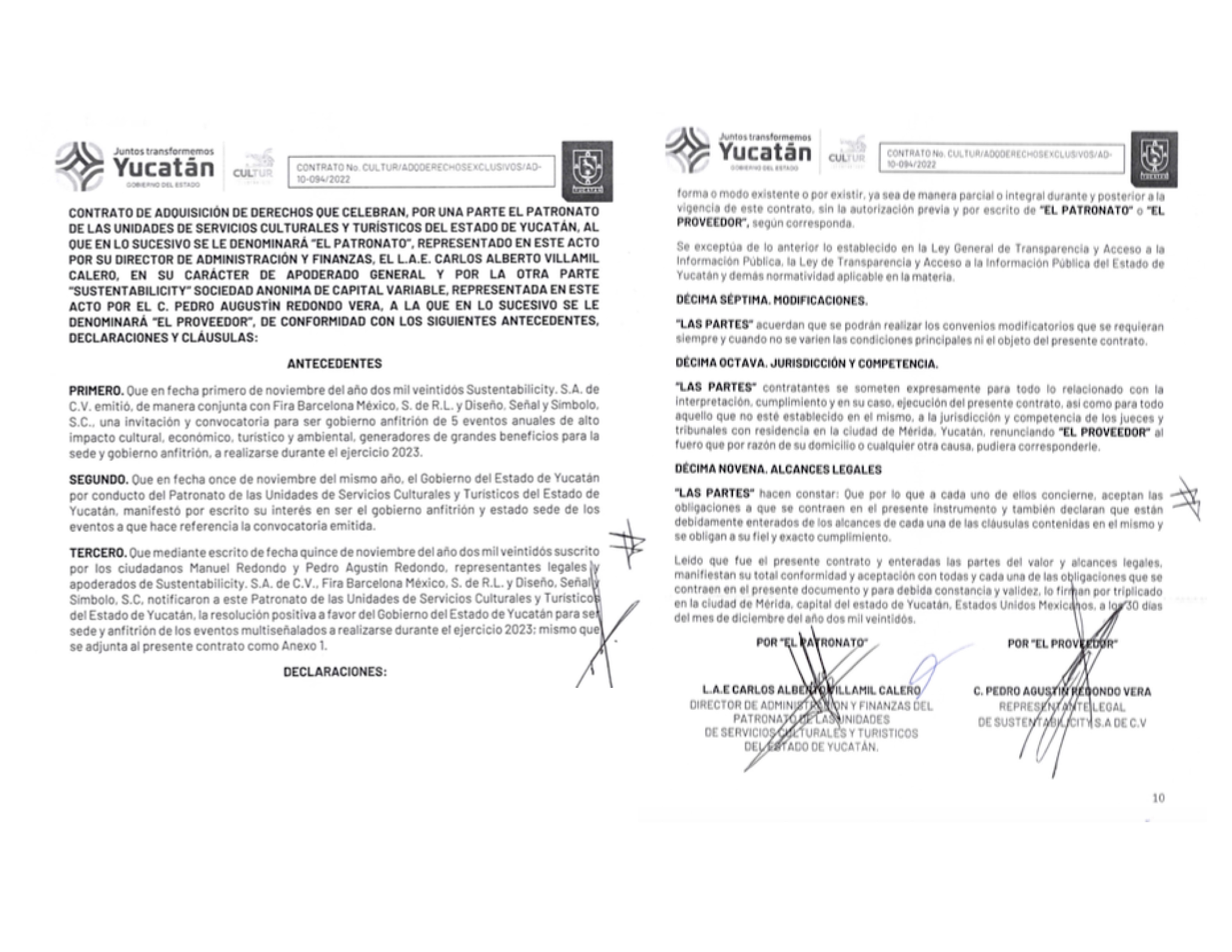 Ahora, la dependencia saqueada fue el Patronato de las Unidades de Servicios Culturales y Turísticos del Estado de Yucatán (Cultur), que encabeza Mauricio Diaz Montalvo, donde se sangraron los recursos públicos para concretar el multimillonario evento, según consta en el contrato CULTUR/ADQDERECHOSEXCLUSIVOS/AD-10-094/022