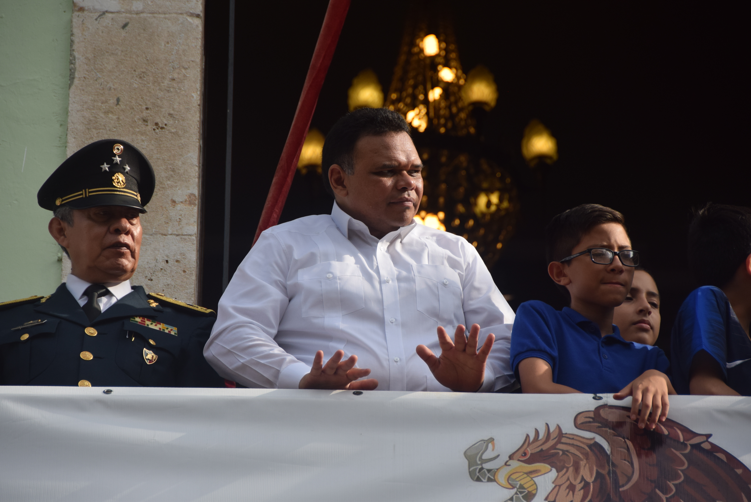 Junto con autoridades civiles y castrenses, el titular del Poder Ejecutivo, Rolando Zapata Bello, presenció por sexta y última vez consecutiva, desde el balcón principal del Palacio de Gobierno, a las agrupaciones que conformaron el derrotero, cuyos integrantes demostraron gallardía durante su marcha, la cual inició en el Paseo de Montejo, pasó por las principales calles de esta urbe y concluyó en el parque de San Juan.