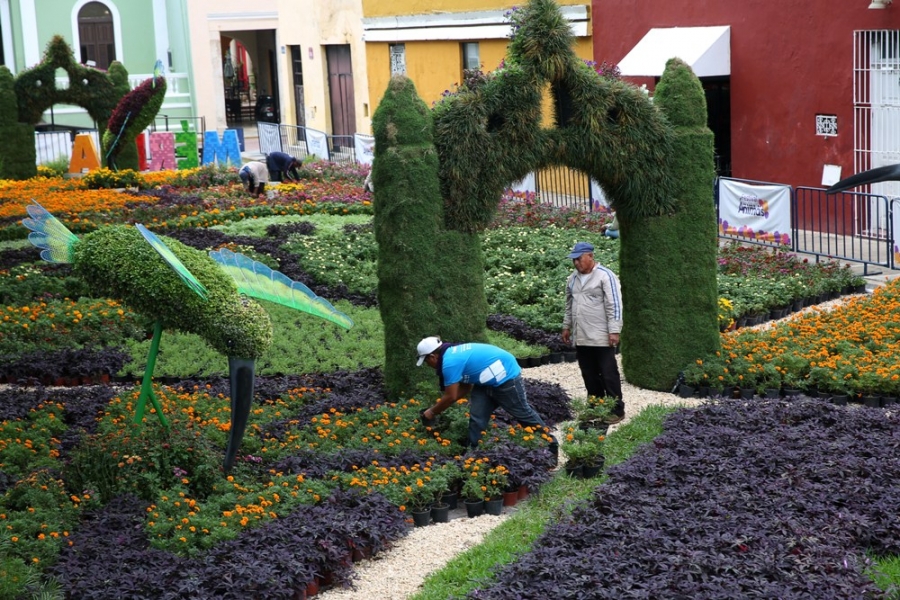 El espacio floral, instalado a un costado del parque de La Mejorada, albergó más de 60 mil flores y plantas de diferentes especies como lo son cempasúchil tradicional y silvestre (xpujuc en maya), crisantemos, petunias, kalanchoe, Mona Lisa e ipomeas, con las que se dio forma a figuras alusivas al Día de Muertos y a Mérida en general, como los arcos formados con follaje que representan a los que antiguamente delimitaban la ciudad.