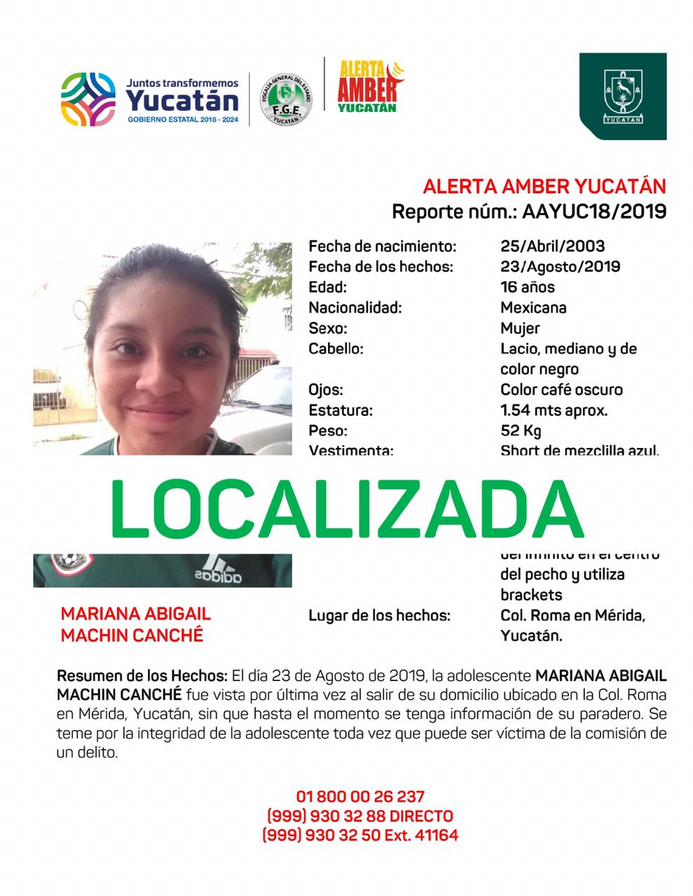 Mariana Abigail Machín Canché, de 16 años de edad, quien se encontraba en calidad de desaparecida desde el pasado mes de agosto cuando salió de su domicilio en la colonia Roma, de Mérida, fue localizada en buenas condiciones de salud, informaron autoridades de la Fiscalía General del Estado (FGE) mediante un comunicado de prensa.