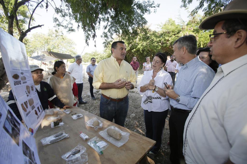 La especialista Sylvianne Boucher explicó al alcalde algunos detalles de varias piezas encontradas durante los trabajos de rescate y que indican las relaciones comerciales que tuvo esta zona con el centro de México y el sur de Guatemala.