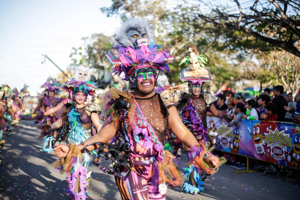 En el desfile de hoy, animado por batucadas, bailarines y música festiva, participaron la conductora Cynthia Urías y el actor Irving Peña, que se sumaron a la fiesta saludando y repartiendo souvenirs a los asistentes desde los carros alegóricos del Comité Permanente del Carnaval de Mérida.