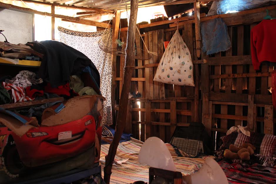 La casa es un poco más grande, pero el mismo material improvisado, láminas de cartón en el techo, láminas de zinc a los lados, algunas lonas que no han logrado impedir que sus pertenencias se mojen; y afuera una mesa y un fogón, es la cocina, para la comida usan leña que recogen todos los días, y una olla negra, ya vieja, de tanto uso.