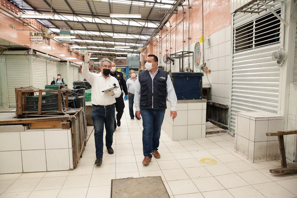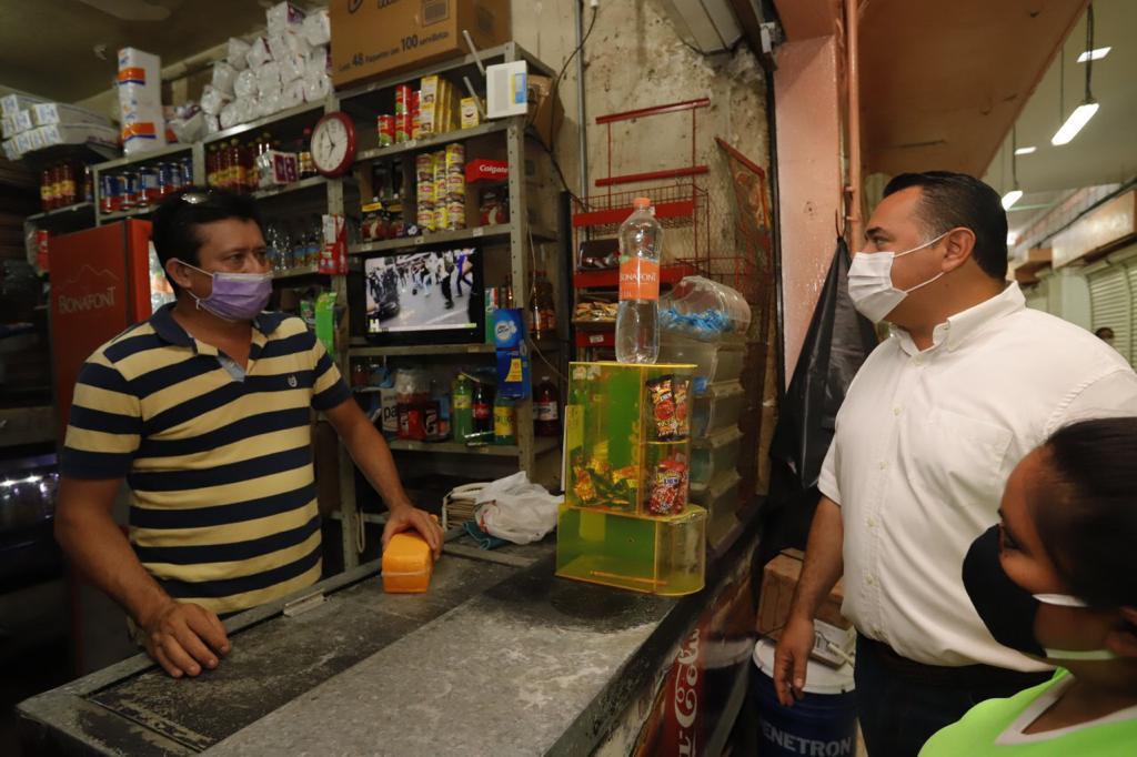 Durante el recorrido, el alcalde Renán Barrera dio la bienvenida a los locatarios del área de chicharroneros y frutas y verduras del Mercado Lucas de Gálvez, a quienes pidió su colaboración para mantener en óptimas condiciones sus espacios, ya que eso permitirá combatir la propagación del virus.