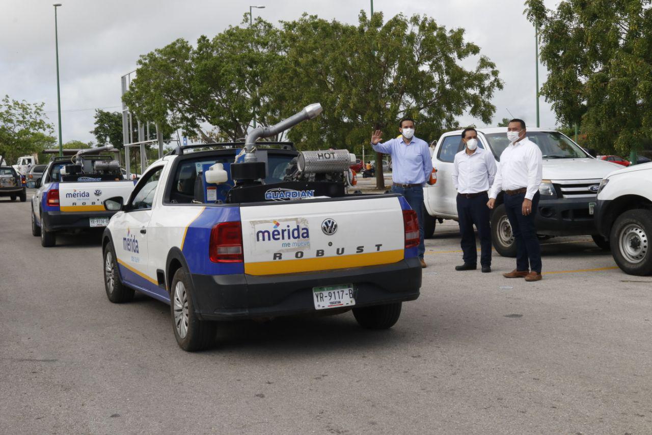 Para estos fines, el Gobierno del Estado, a través de la SSY, empleará 49 vehículos con máquina y operador de la dependencia estatal, 10 de la Secretaría de Seguridad Pública (SSP) y 6 unidades brindadas por el Ayuntamiento de Mérida, dejando a disposición de esta estrategia un total de 65 vehículos para fumigación terrestre.