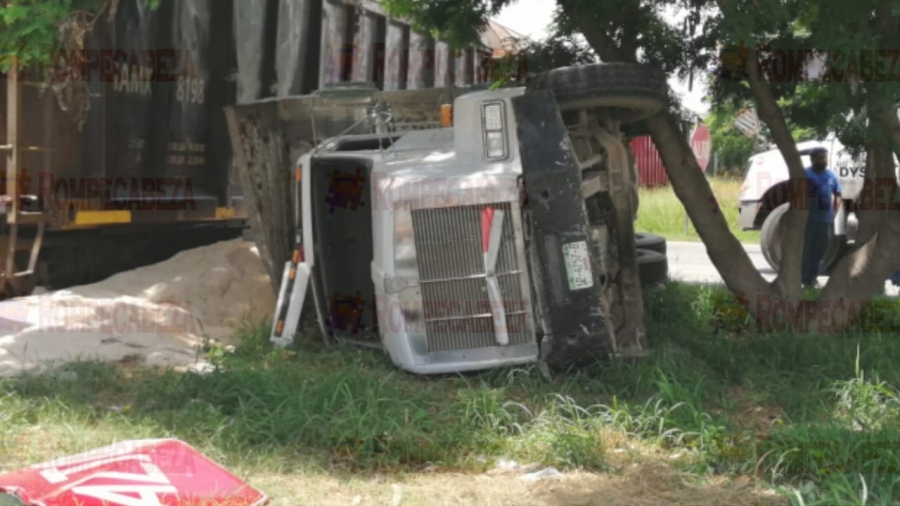 Por el fuerte impacto con el tren el camión se volcó sobre uno de sus costados, mientras que su carga terminó regada en el suelo.