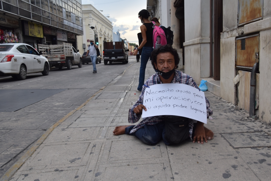 Leopoldo pide limosna todos los días desde hace cinco meses en Mérida, la pandemia del Covid-19 lo varó en Yucatán, asegura que ninguna autoridad se le ha acercado para apoyarlo al menos con una silla de ruedas para poder desplazarse, pues por su condición tiene que arrastrarse.