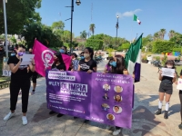Como parte de un movimiento que busca promover la aprobación de la Ley Olimpia a nivel nacional, un grupo de feministas pertenecientes al Frente Nacional para la Sororidad se manifestaron esta mañana en la plaza grande del Centro Histórico de Mérida.