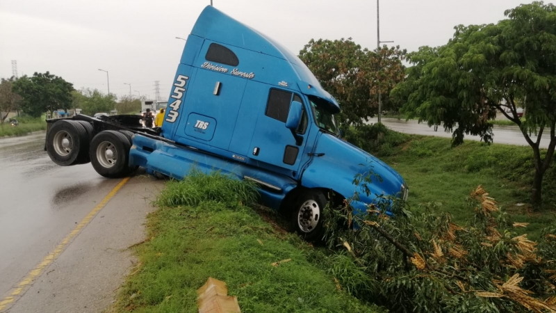 Debido al piso mojado ocasionado por la lluvia que se presentó este sábado en la capital yucateca, el conductor de un tráiler procedente del Estado de Michoacán perdió el control de la pesada unidad y tras “patinar” se salió del Periférico de Mérida.