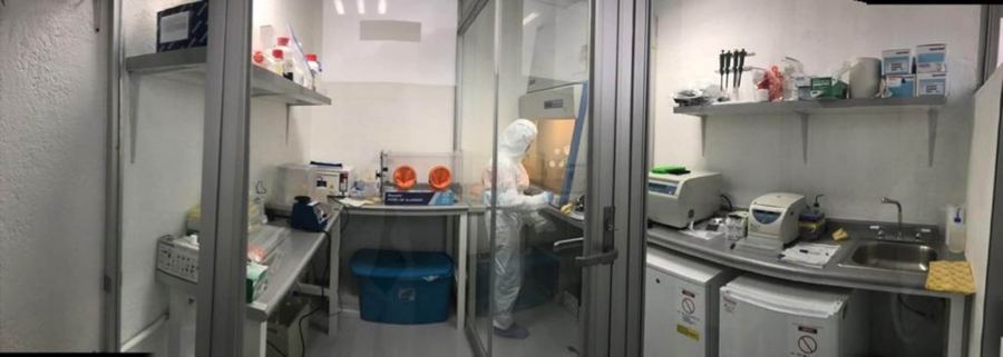 Quienes entran en este espacio prácticamente deben cubrirse de cuerpo entero para no interferir con las muestras. Adentro hay una campana de flujo laminar, que ayuda a prevenir cualquier contaminación, y cuentan con luz ultravioleta (UV), para que cuando se termine de trabajar se irradie la habitación para destruir cualquier resto de ADN.