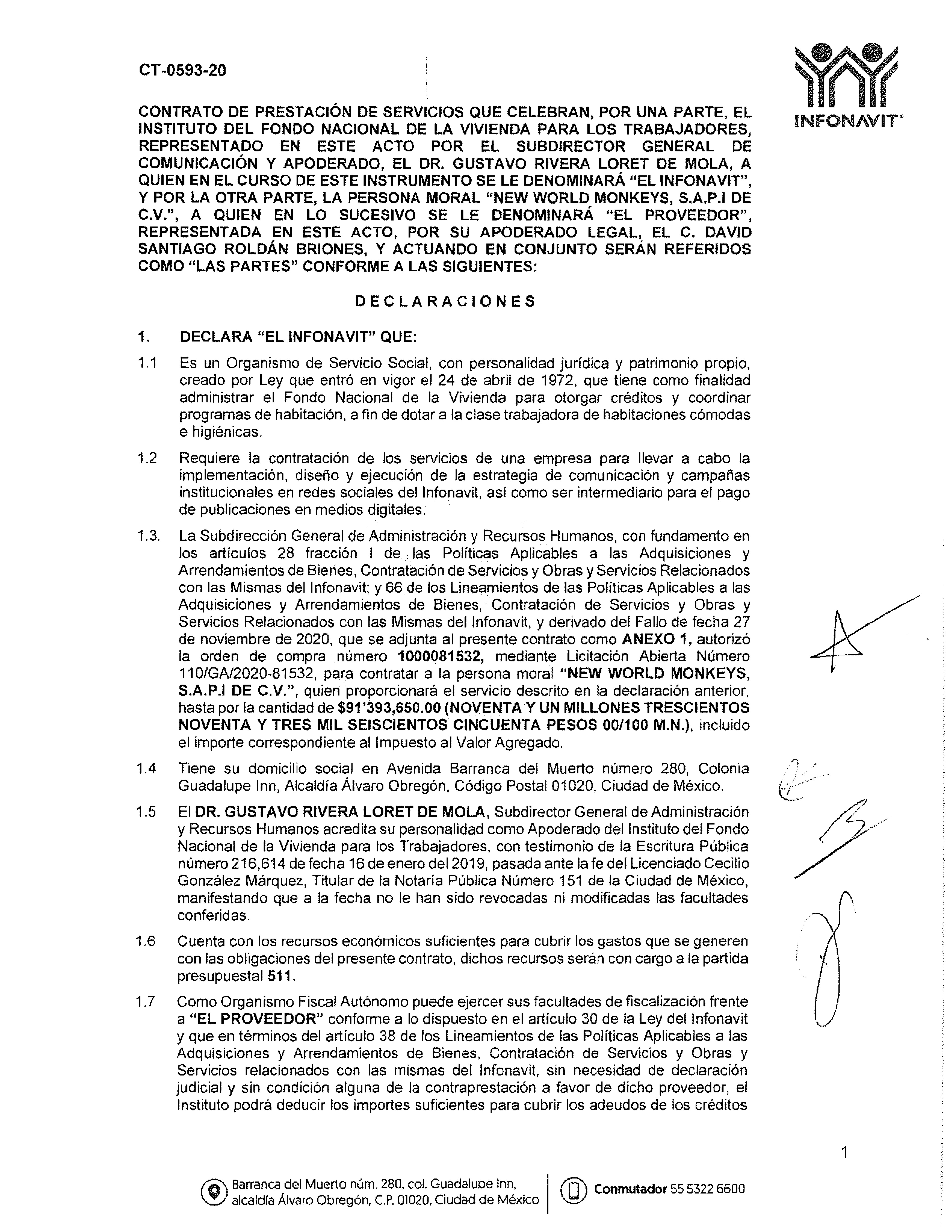 De acuerdo con el contrato CT-0593-20 en poder de este matutino, además de los 31 millones de pesos por sus servicios en el diseño y ejecución de la estrategia de comunicación y campañas institucionales en redes sociales del Infonavit, New Words Monkeys obtuvo el 10 por ciento por ser intermediario para el pago de publicaciones en medios digitales.