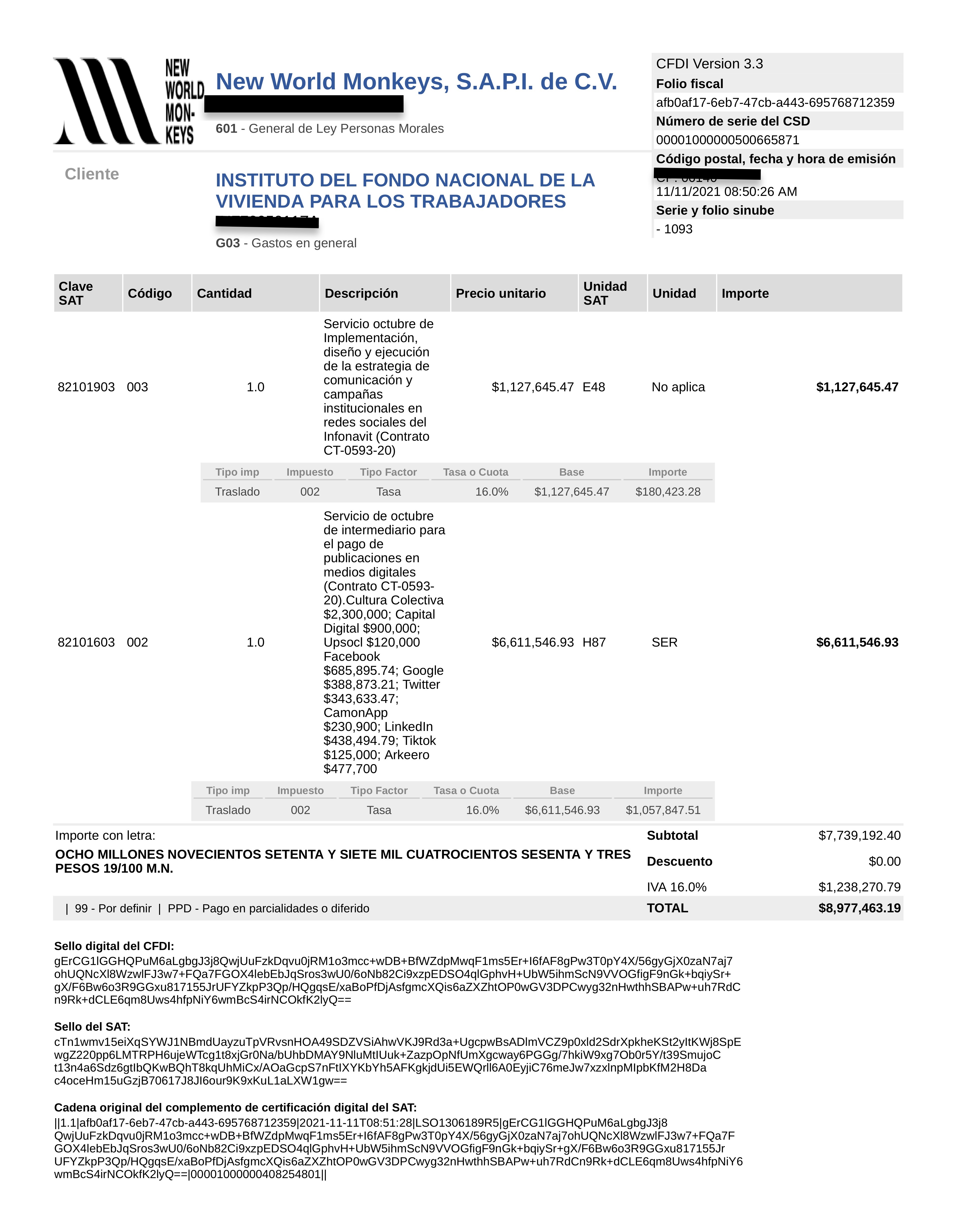 A menos de cuatro meses de que concluya el contrato firmado entre New Monkey Words y el Infonavit, la factura número 1093 es donde más dinero se cobró con 8 millones 977 mil 463.19 pesos emitida el 11 de noviembre del 2021