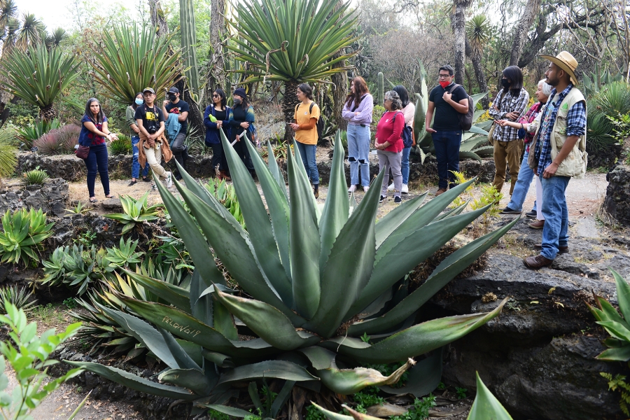 Durante una visita guiada por la Colección Nacional de Agaváceas y Nolináceas, el pasante de maestría expuso: para distinguir los magueyes del resto de las plantas del desierto, se pueden ver sus hojas: lanceoladas (puntiagudas), con una espina en la punta -llamada apical- y “dientes” en el margen.
