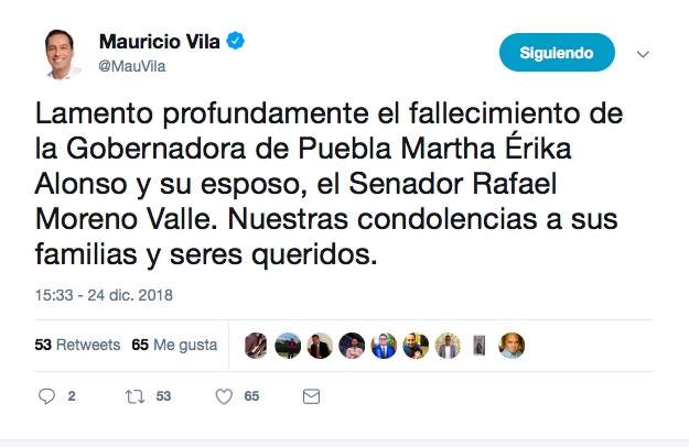 “Lamento profundamente el accidente fatal en el que perdieron la vida Martha Ericka Alonso, Rafael Moreno Valle y otras personas. Que descansen en paz. @AcciónNacional está de luto”, cito el michoacano en su cuenta oficial de esa red social virtual.
