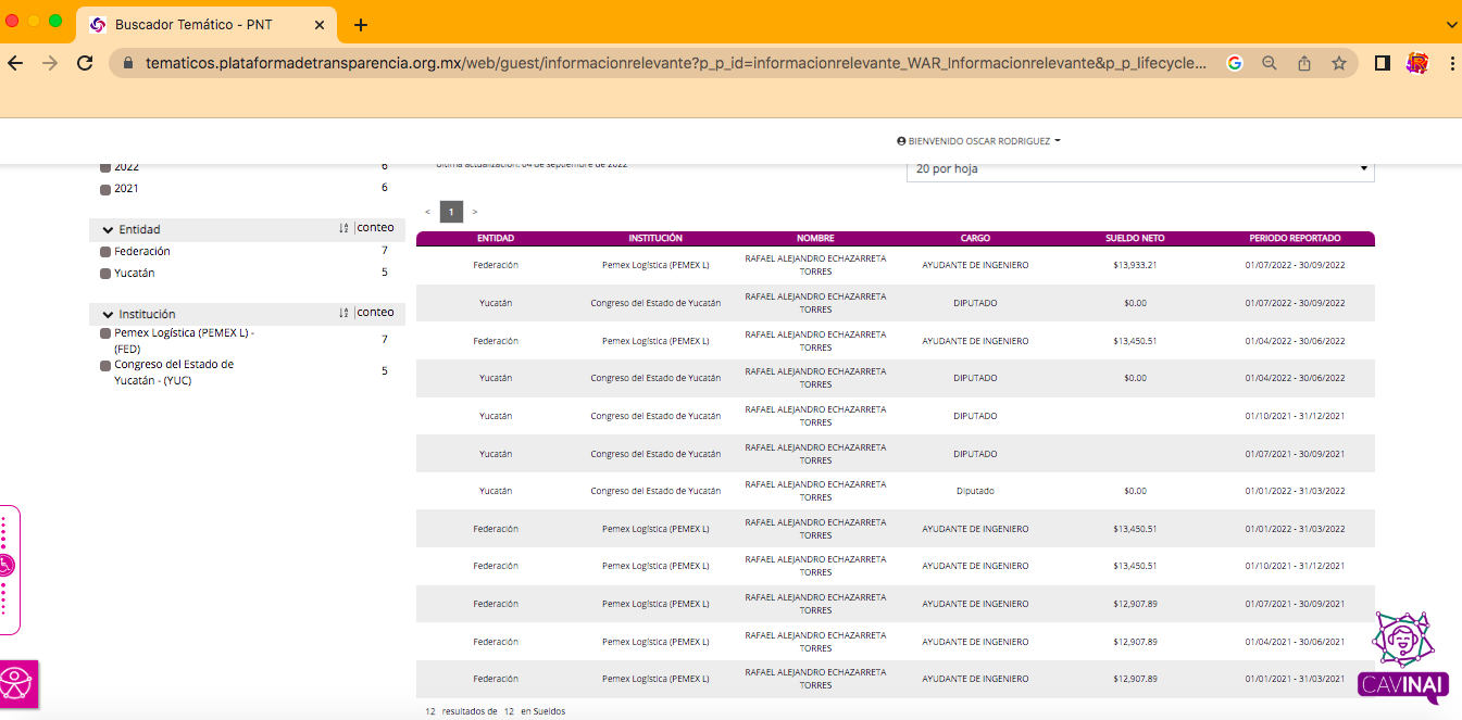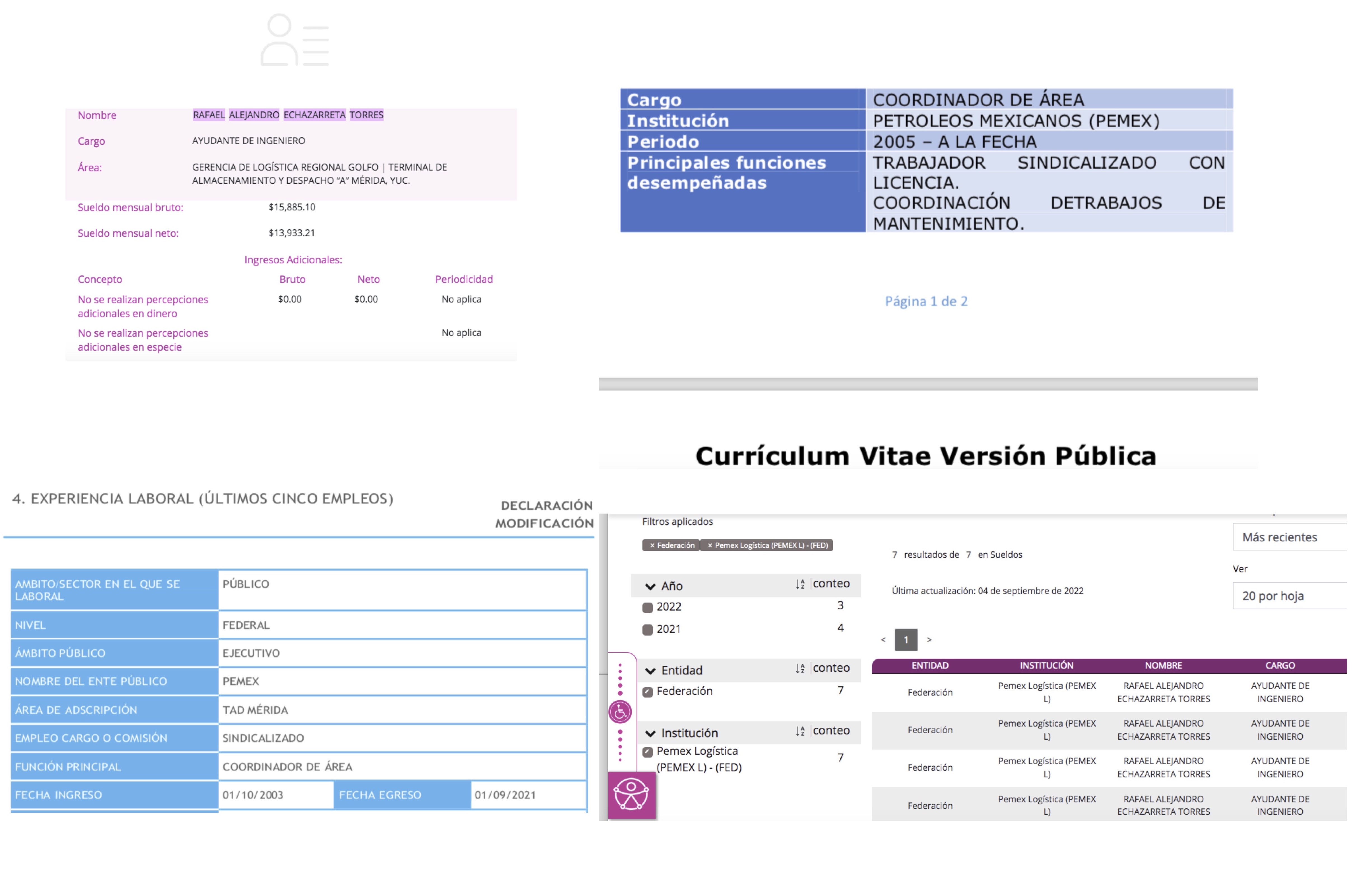 En la PNT solo aparece evidencia de cobro como funcionario federal por parte del Echazarreta durante los años 2021 y 2022 al igual que en el padrón de sindicalizados de Pemex, bajo el puesto de Ayudante de Ingeniero, lo que es contrario a lo expuesto por el diputado en su curriculum entregado al Congreso donde asegura haber ingresado a Pemex desde 2005 y contar con el puesto de coordinador de área.