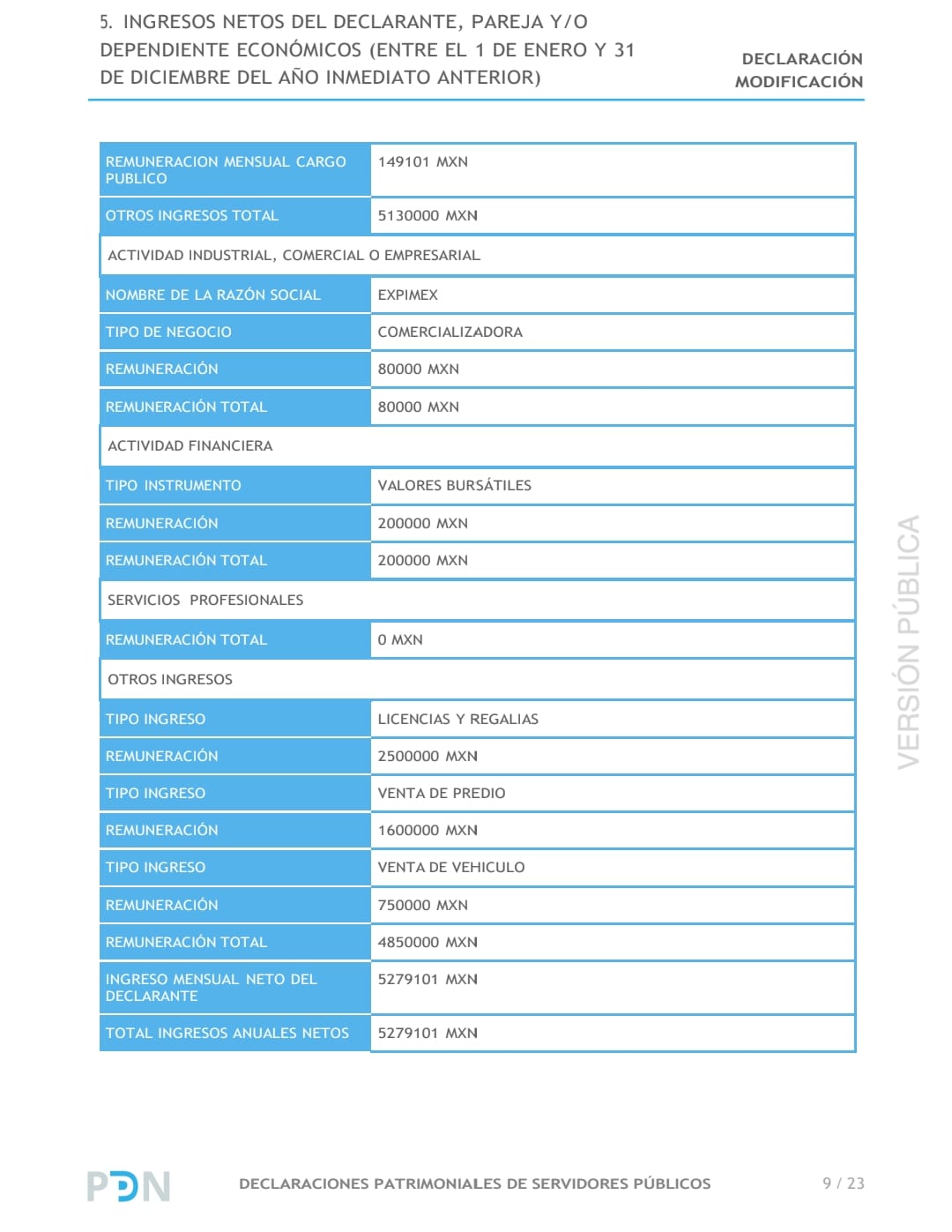 Mediante su declaración patrimonial y curriculum vitae obtenido a través de solicitudes de transparencia se pudo conocer las millonarias ganancias que el legislador obtuvo gracias a su actividad empresarial, como funcionario federal y diputado local, solamente en el 2021.