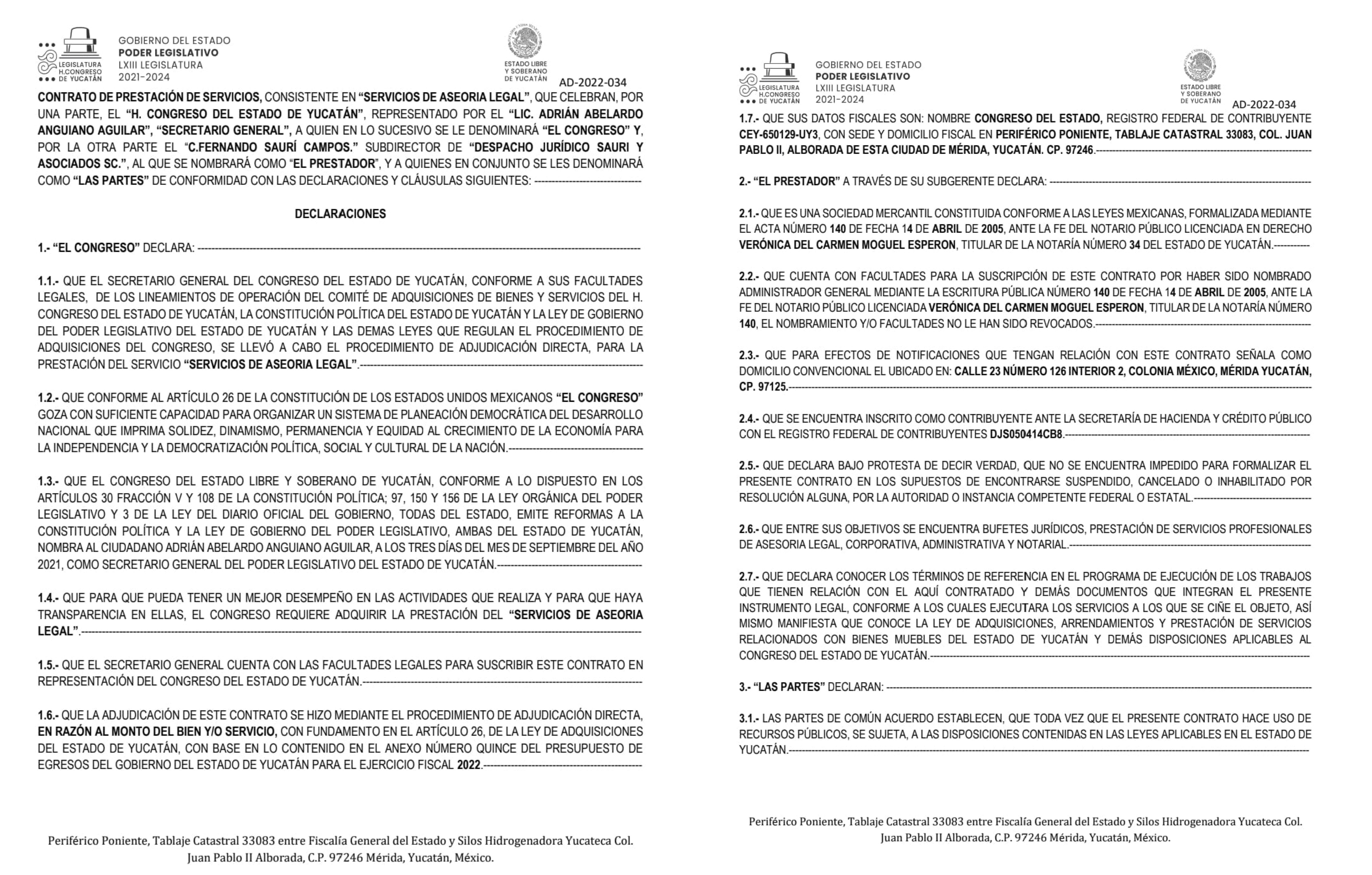 De acuerdo con el documento en poder de este medio, el firmante como prestador de servicios es Fernando Sauri Campos, quien según lo indagado mediante redes sociales virtuales, cuenta con una patente como notario público número 12 con sede en la capital yucateca, por el Congreso estampó su rúbrica el secretario General, Adrián Abelardo Anguiano Aguilar.